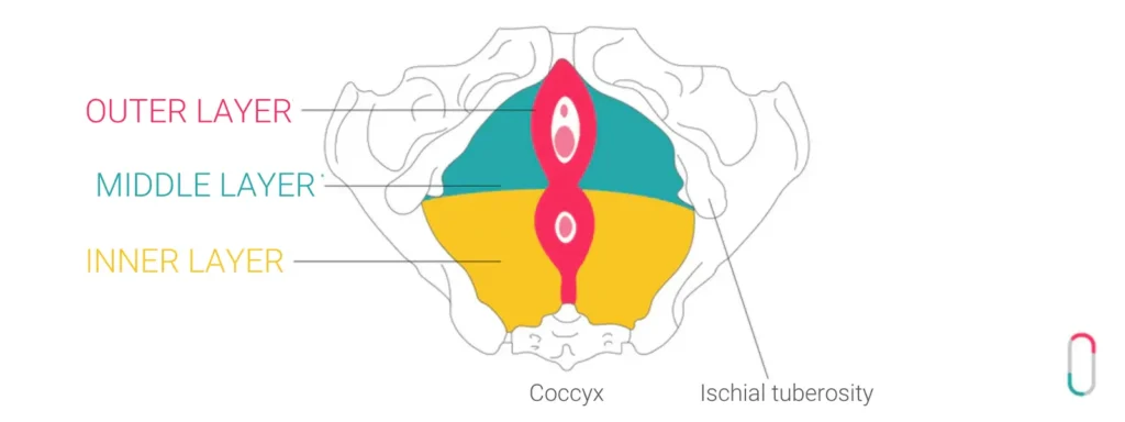 The pelvic floor is a muscular plate that closes off the abdominal cavity and the pelvic organs from below. It essentially supports our organs, and during pregnancy, it even carries the increasingly heavier baby. It consists of three layers of muscles stacked on top of each other in a fan-like manner.